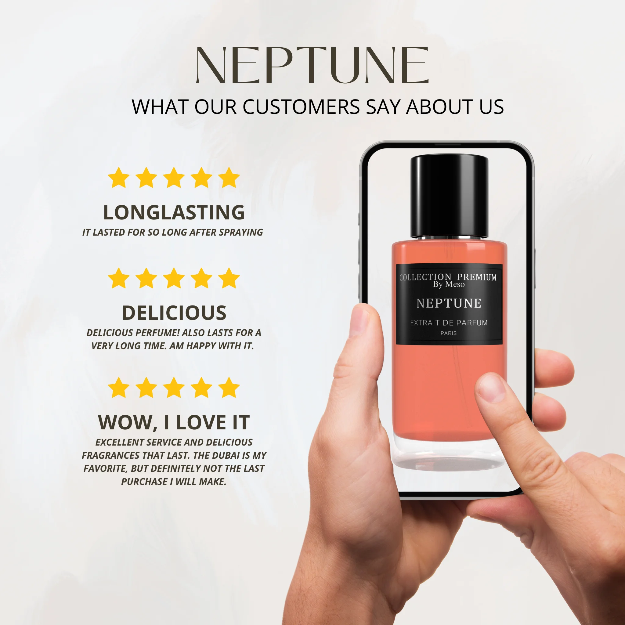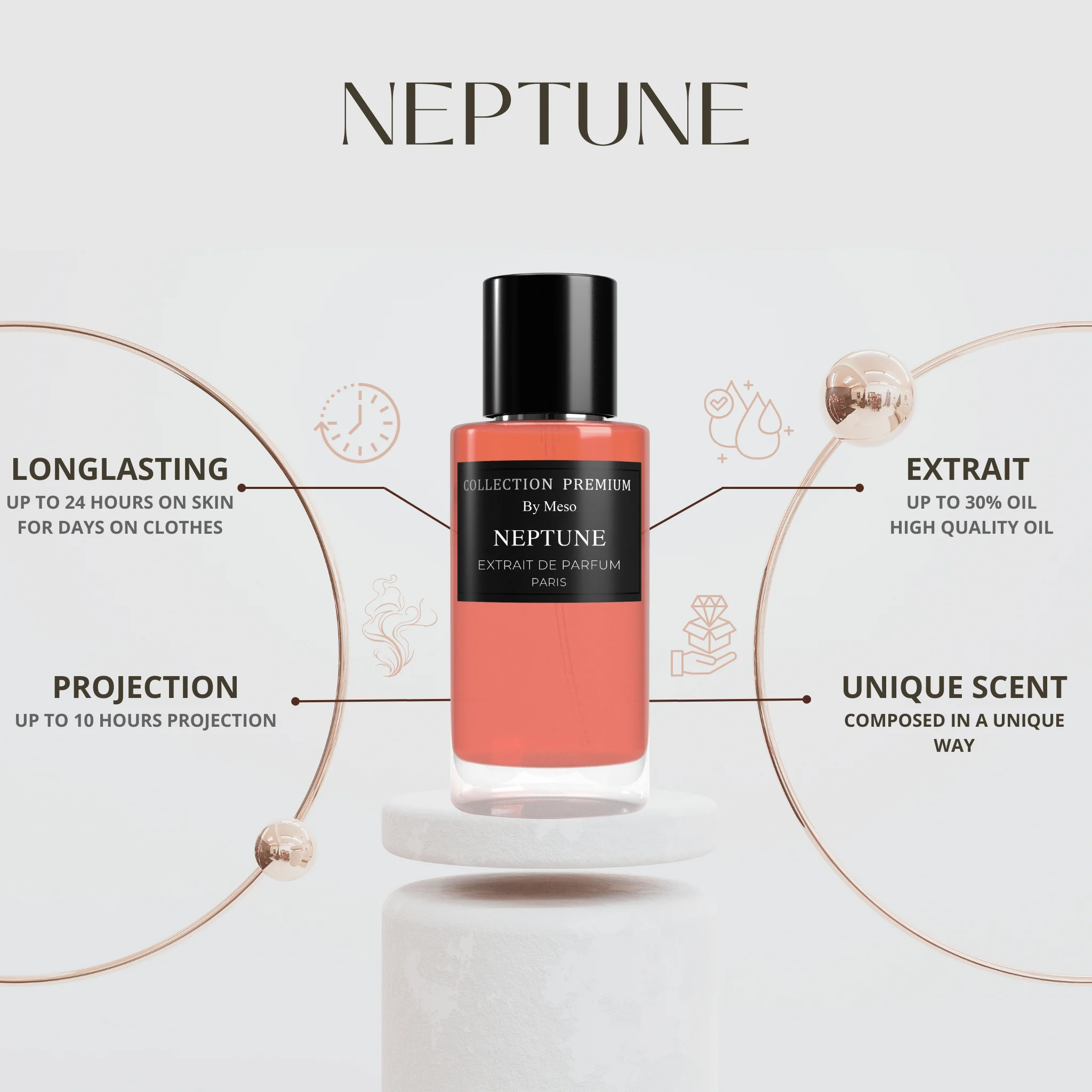 Neptune invites you on an amazing olfactory journey that goes beyond the usual norms, where the scent, the presentation and the overall experience merge into a contemporary and distinctive perfume that reflects the individuality of the modern woman. A fragrant voyage of discovery that redefines the familiar and leaves a lasting impression.
